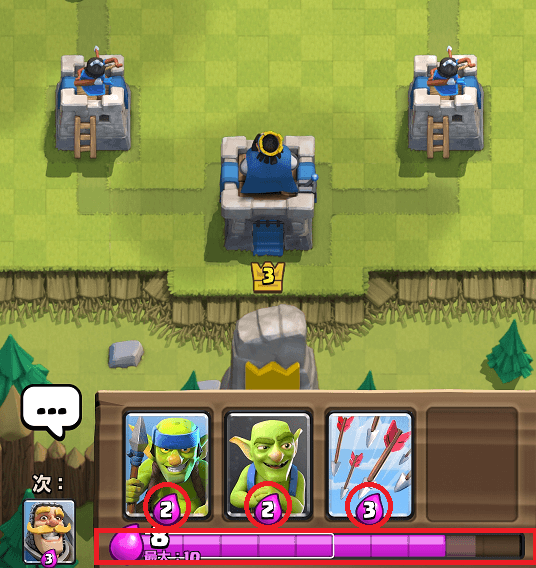 画像:四角い赤枠がエリクサーゲージ、赤丸がカード召喚時の消費エリクサー