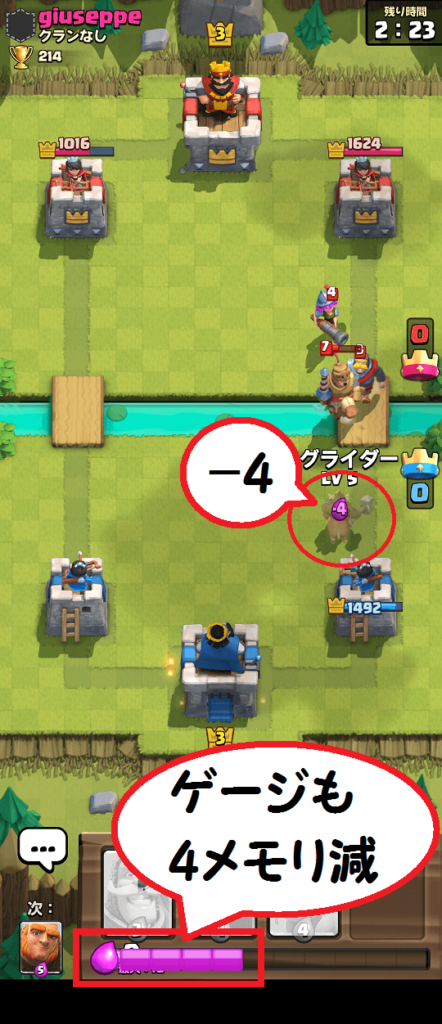 カードごとにエリクサー数が表示され、配置と同時にエリクサーのゲージも同じ数だけ減ります。