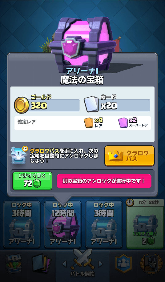 - バトルする日中にアンロック時間の短い宝箱を開ける