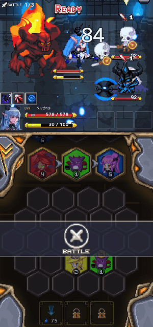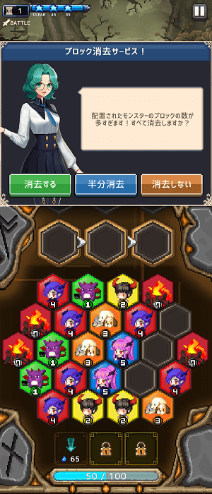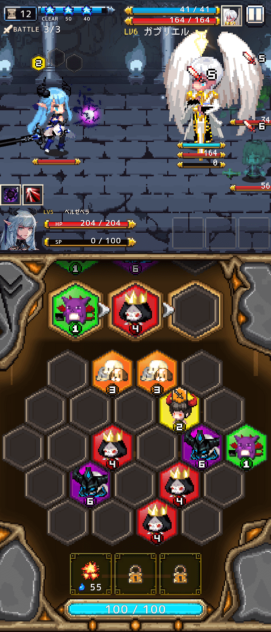 同レベルのモンスターブロックが3つ並ぶと1つに集約、ワンランク上のレベルに変換され残ります。同時にモンスターを召喚して敵に攻撃。