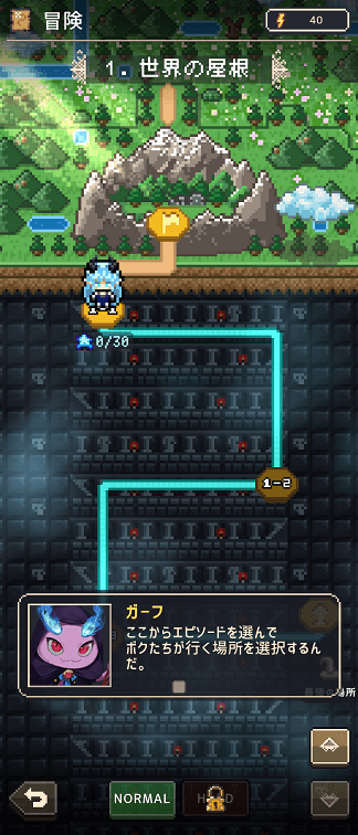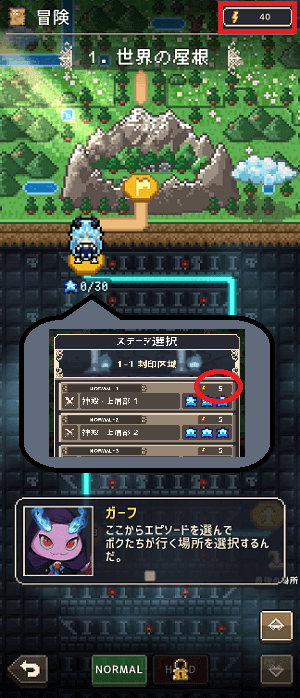 序盤は冒険のステージ選択で消費するスタミナ5に対して、所持スタミナ40とたっぷりあるので冒険をサクサク進められます。