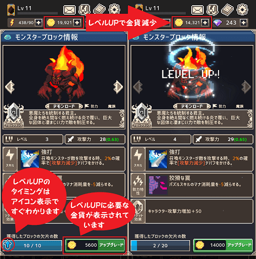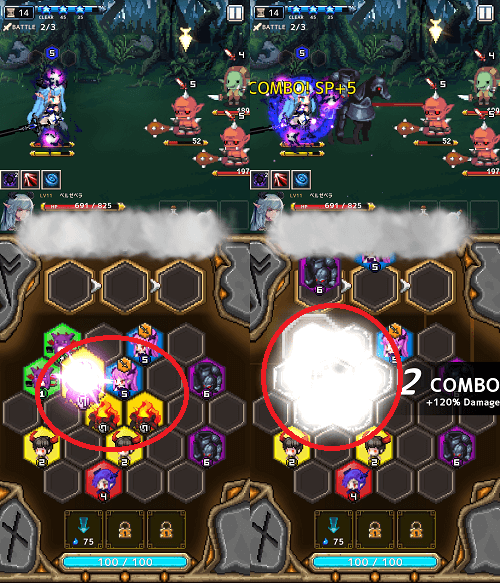 隣に同ランクのモンスターブロックが3つ並べばコンボが発生し連続攻撃で敵に大ダメージを与えます。