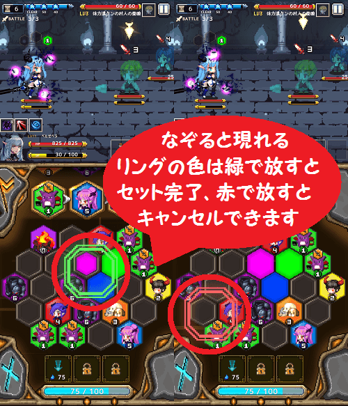 ターン制のバトルはパズルを組み合わせて攻撃。待機中のモンスターブロックを同レベル並ぶようになぞって配置しましょう。