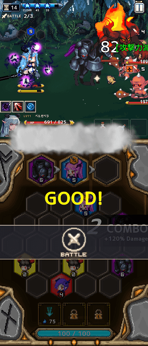 戦闘ステージのパズルはあるあるだけどうまく組み合わせればコンボやスキルが発動して連続攻撃。