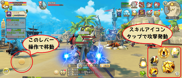 プレイヤーの操作は画面左下のレバーで移動し、画面右下にタイプ別にズラリと並んだスキルアイコンをタップひとつで、強力な単体攻撃や範囲攻撃のスキル発動できます。
