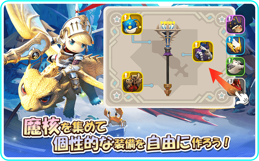 ルミアサガーちび萌え自由大冒険ではクエストクリア報酬やモンスター討伐で入手した魔核で個性的な装備を自由に作れます。