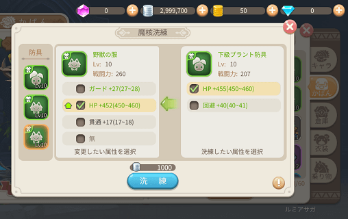 装備が持っている会心率アップや攻撃力アップの効果を洗練させれば新しい装備へ移行可能。