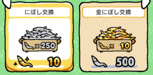 - にぼしと金のにぼしは双方で交換可能。普通のにぼし500個で金のにぼし10個、金のにぼし10個で普通のにぼし250個になります
