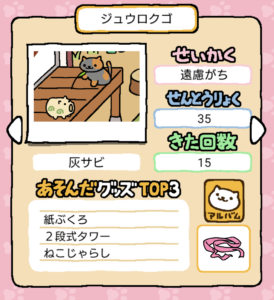 きた回数や遊んだグッズTOP3はねこがくるたびに更新されねこの気を引く参考にできます。
