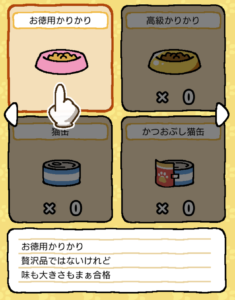 設置するねこのゴハンにはグレードがありタダでもらえるものから金のにぼしでしか買えない高級品までさまざま。