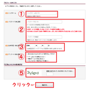 • ユーザ情報入力画面で①から⑤のプロフィールを入力して確認するをクリック